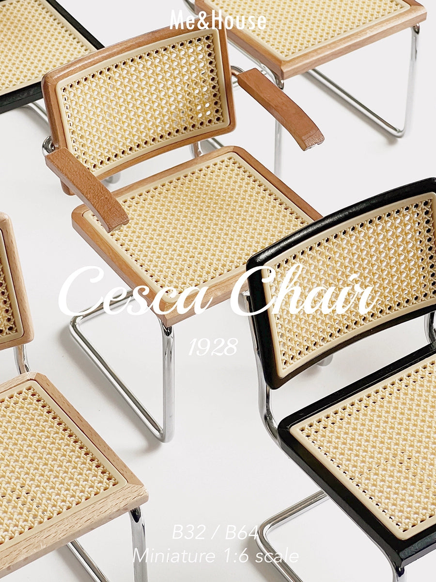 1/6スケールのミニチュア カンチレバー椅子です。BJD、ブライス、オビツなど1/6スケールドールに対応し、アーム付きとアームなしの2種類をご用意しております。シンプルでモダンなデザインは、ドールハウスのリビング、ダイニング、書斎や撮影背景に最適です。