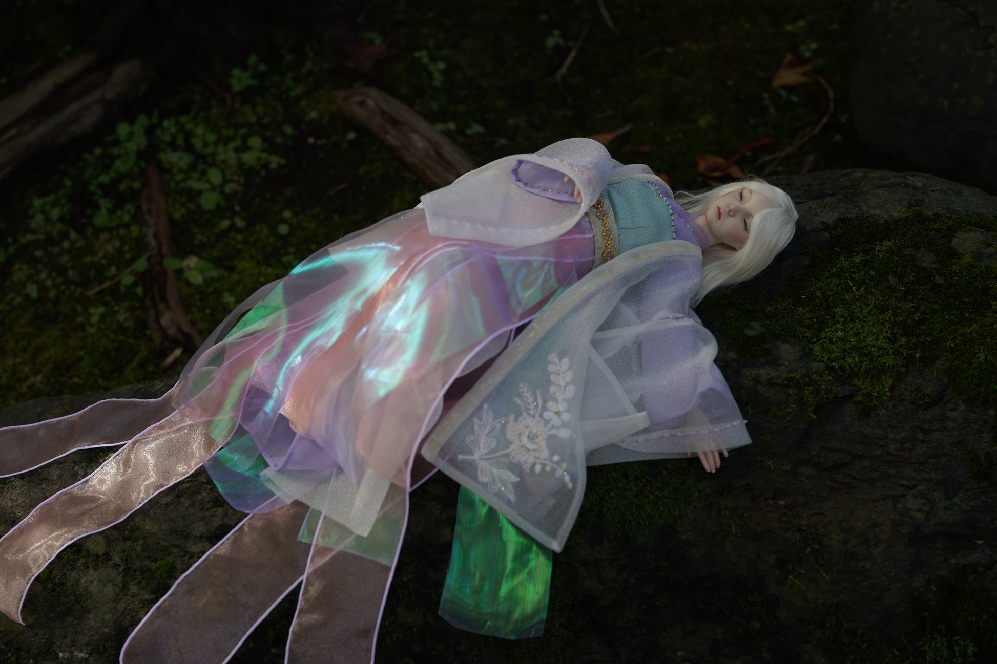 ほのかな香りを想起させる「薫」と名付けられたこの人形は、長いまつ毛と、神秘的な雰囲気を漂わせる穏やかな目を閉じた表情が特徴です。中国の伝統的な漢服と日本の着物の要素が融合した衣装は、流れるようなリボンが風に優雅に舞う天女のような、優美な存在感を醸し出しています。 (このページは展示のみです。ご購入のお問い合わせはお問い合わせください。)